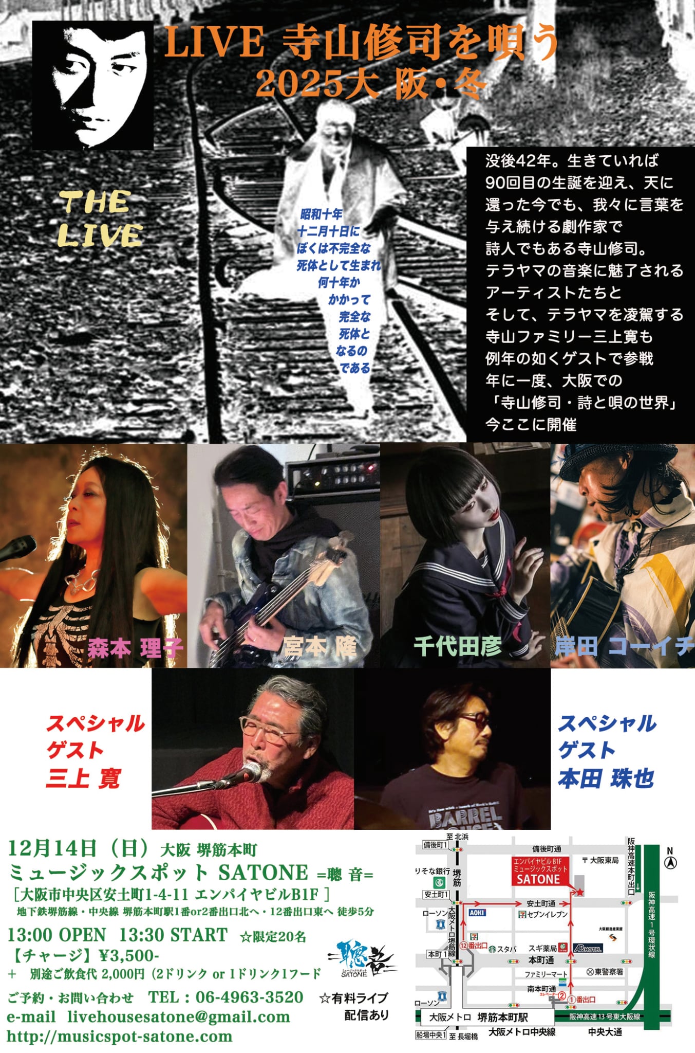 12/14㈰「LIVE寺山修司を唄う2025冬」 森本 理子(うた)宮本 隆(ベース) 千代田彦(パフォーマンス) 岸田 コーイチ(うた・ギター) ゲスト 三上 寛(うた・ギター) 本田 珠也(ドラムス)